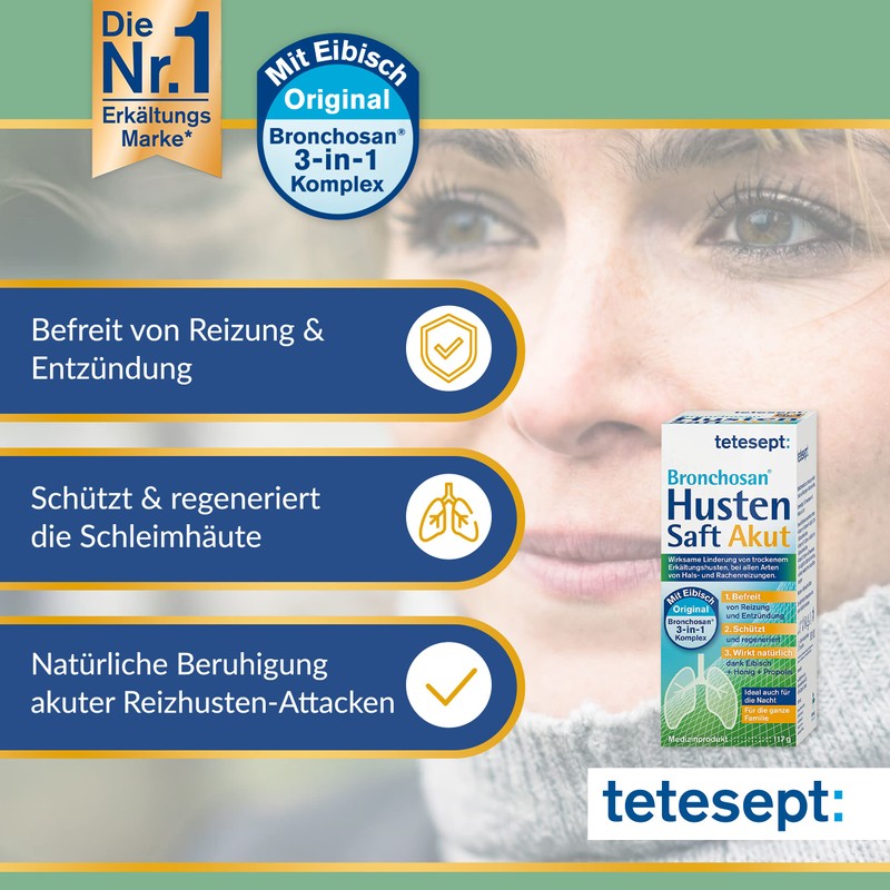 Der tetesept Bronchosan Husten Akut Saft wirkt bei trockenem Erkältungshusten und allen Arten von Hals- und Rachenreizungen. Der Bronchosan