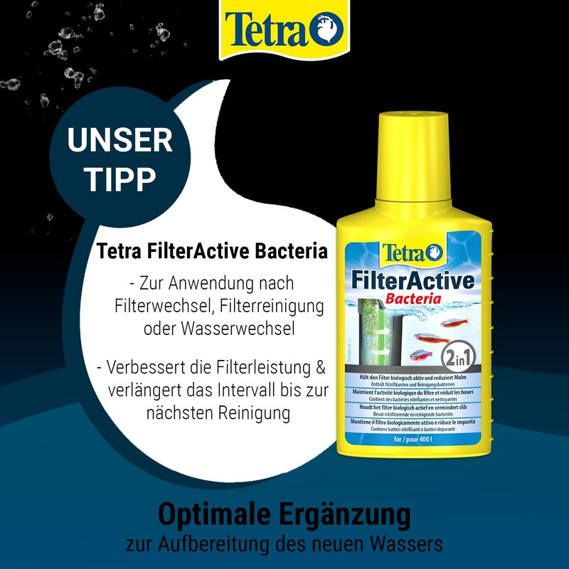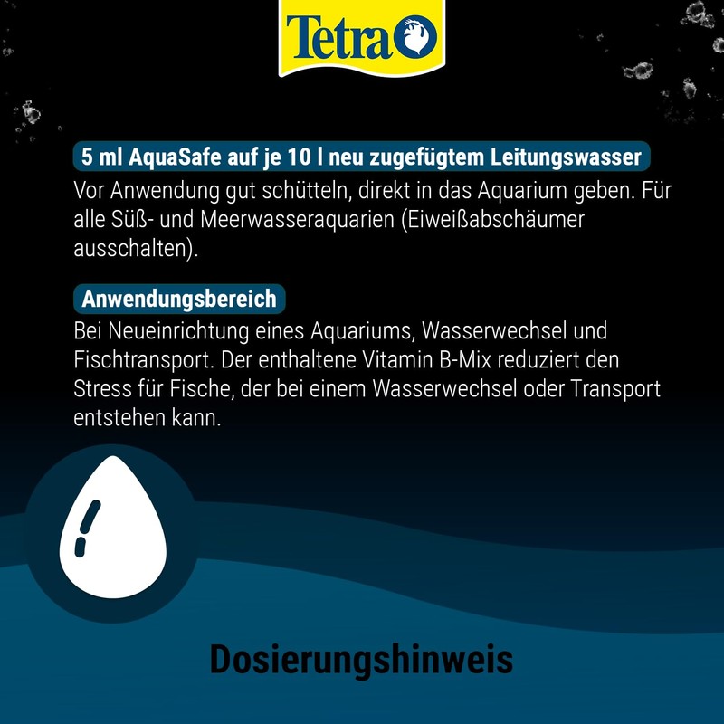 • Tetra AquaSafe neutralises these substances and makes them harmless to fish. It ensures clear water in the aquarium as it promotes the growth of beneficial bacteria. It is quickly dissolvable, acts quickly with long-term effect
