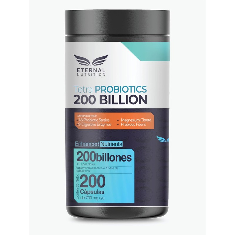 TETRA PROBIOTICS 200 BILLONES - 200 capsulas (200 BILLONES UFC por porcion), Complejo de Probioticos con Fibras Prebioticas, Enzimas Digestivas y Citrato de Magnesio -by Eternal Nutrition