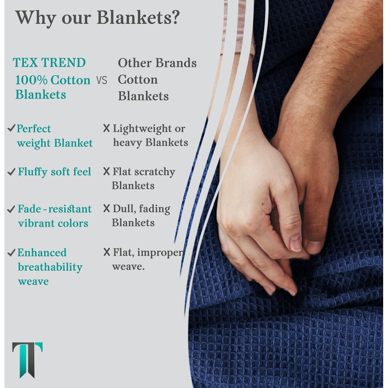 Tex Trend 100% Cotton Blanket – Soft and Breathable Twin XL Navy Blue Waffle Blanket – All Season Comfort – Suitable for Bed Layering, Sofa, Couch (60”x90”)