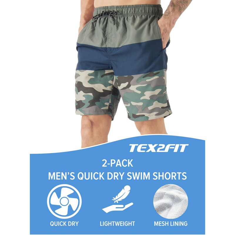 TEX2FIT 2-Pack Men's Swim Shorts with Pockets, Quick Dry Swim Trunks with Mesh Lining (Floral AOP/Camo, X-Large)