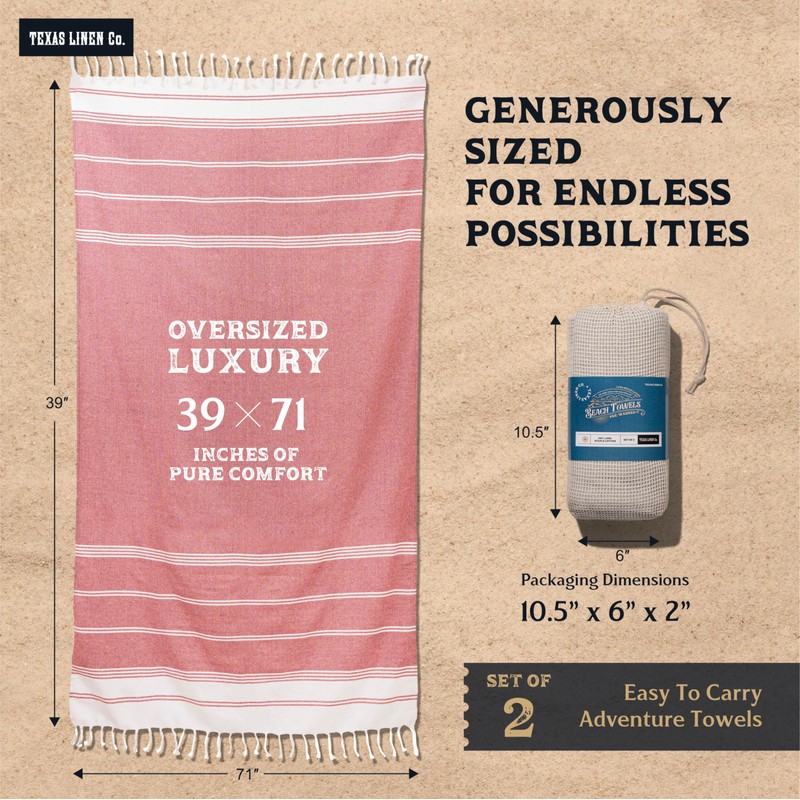TEXAS LINEN CO. Quick Dry Beach Towel - Turkish Cotton Beach Towels 2 Pack - 39" x 71" Sand Proof Beach Towels, Oversized Beach Towels for Adults, Large, Lightweight Bath Pool Swim Towel - Red Diamond