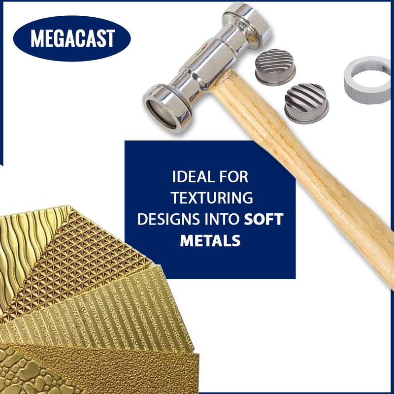 - Application: First, you choose the texture face which you would like to use then unscrew the threaded end on the hammer. After that place the texture face into the threaded ring which you removed from the hammer. Screw the threaded ring back onto the hammer then place the metal you want to texture onto a bench block and strike firmly with the hammer.