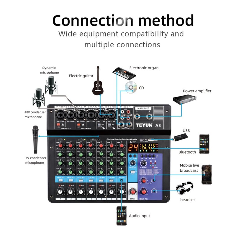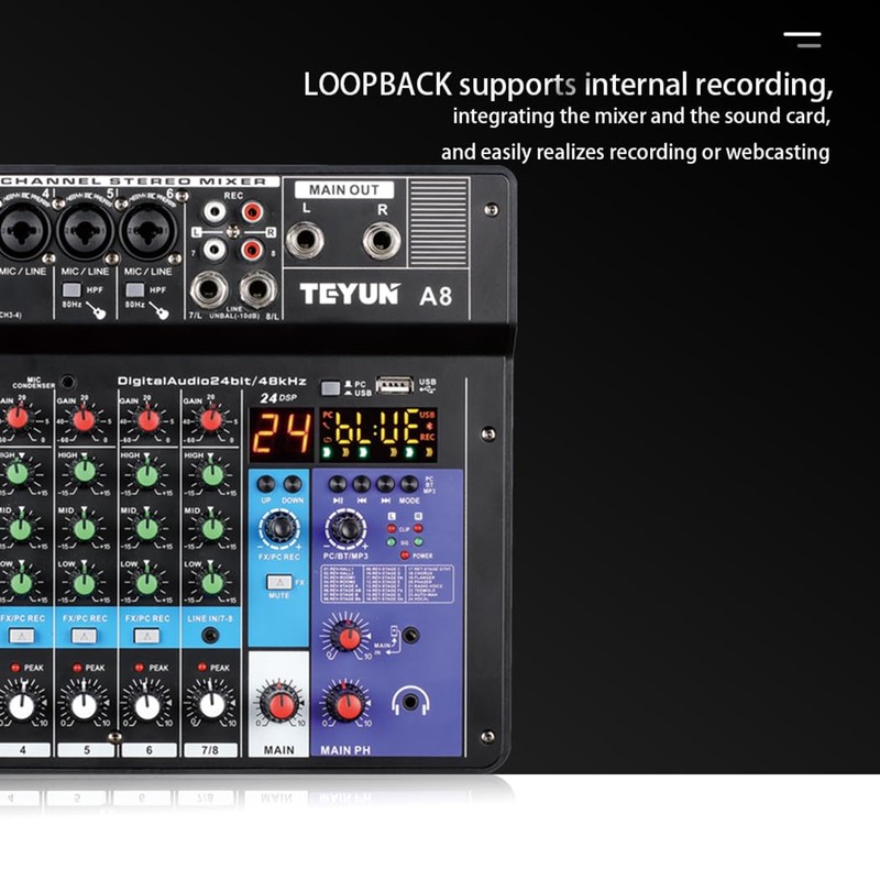 TEYUN 8 Channel Professional Portable Mixer Sound Mixing Console Computer Input 48v Power Number Live Broadcast A8 New (8-Channel)