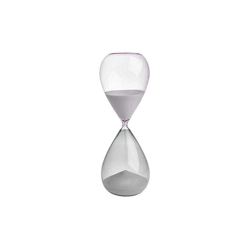 - Glass tint: the glass of the hourglass is gray and pink in color, the sand is white