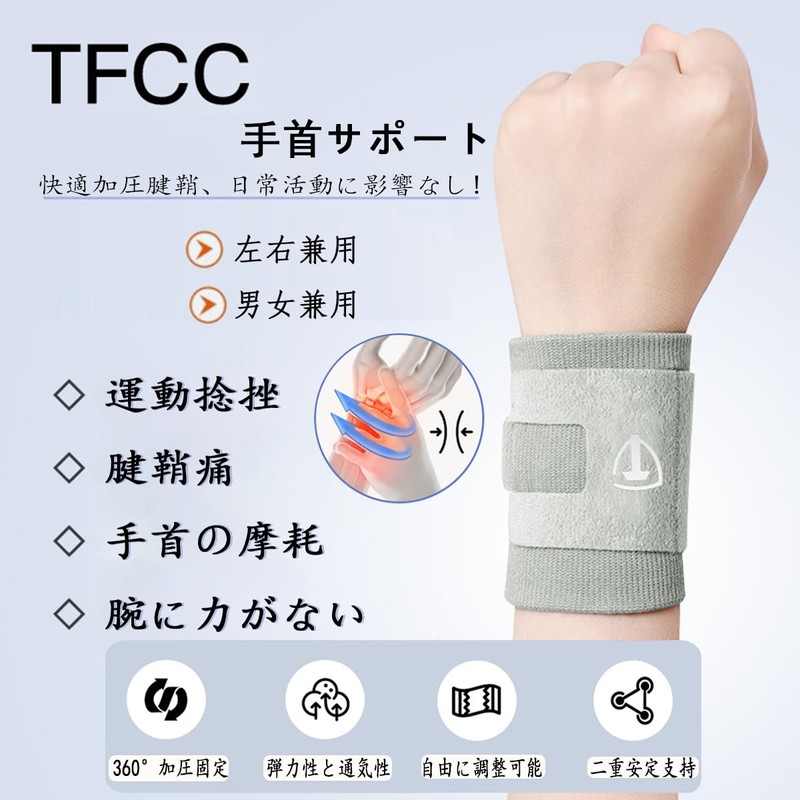 TFCC 手首 サポーター 【二重加圧/柔らかくて快適】 腱鞘 関節 固定 圧力調節 手首 サポーター 薄手 通気性 吸汗速乾 怪我防止 手首用サポーター 超薄型 スポーツ 家事 育児 パソコン/スマホ操作 男女兼用 (1, グレー)