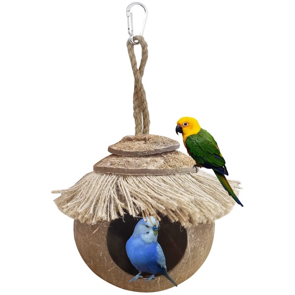 - 【Natural Coconut Material】Our parakeet nesting box adopts preferred natural coconut shell. Each coconut is carefully selected making it 100% safe and non-toxic,ensuring its durability and safety. The jute rope tied on top of the Coco Bird Hut is to attach it to any place inside or outside your home, yard, balcony.