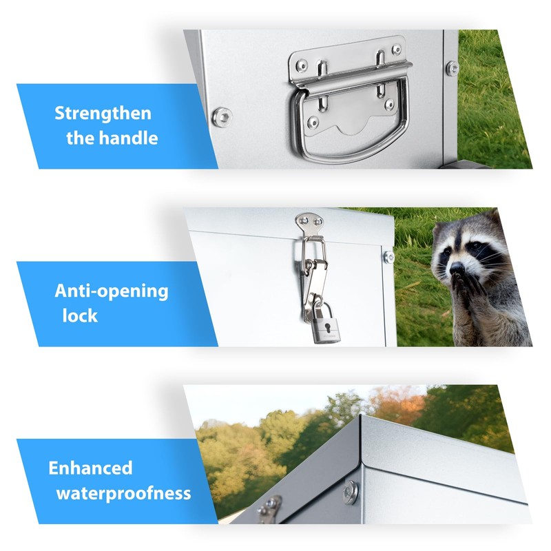 • Lock and handle: The upgraded lock allows you to lock the lid while fastening it to prevent the lid from being opened by a raccoon. The top handle improves waterproofness and the side handle enhances bearing capacity.