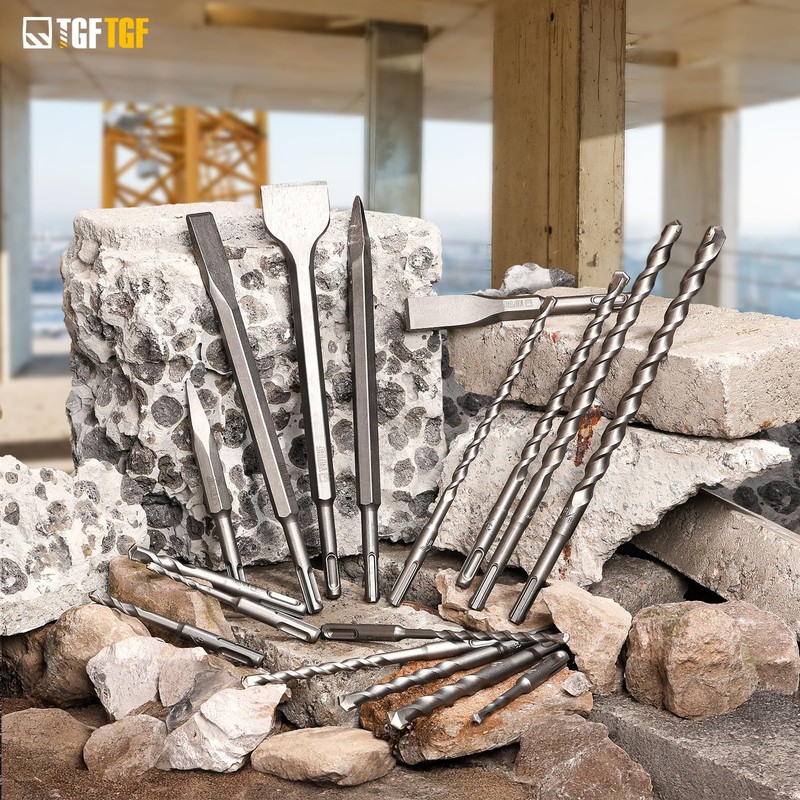 TGFTGF 17-Piece SDS Plus Rotary Hammer Drill Bits and Chisel Set, YG8C Carbide Tips, SDS Plus Bits, Masonry Drill Bit Set for Concrete, Brick and Stone, with Storage Case, Ideal Tool for DIY, Home