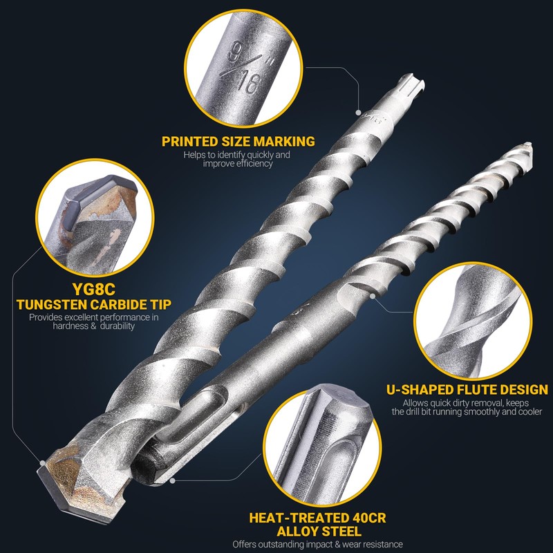 - 【Durable YG8C Carbide Tips】These SDS Plus rotary hammer drill bits feature a tougher YG8C carbide tip and carbide steel blade for increased hardness and greater wear resistance. The chisels are finely ground for efficient cutting and drilling, making them ideal for tile removal, grooving and light demolition work. Sandblasted surface enhances rust resistance, ensuring reliable performance in concrete, brick and stone. Fully heat-treated for strong impact resistance and long service life.