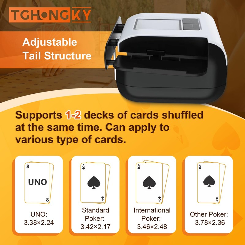 - SUITABLE FOR DIFFERENT CARD TYPES Meet the requirements of fast shuffling cards for UNO, support 1-2 decks of cards at the same time. The automatic card shuffler is suitable for different card types and is designed with an adjustable tail structure. They are good for playing poker, UNO, Texas Hold Em, Blackjack, Omaha, Baccarat etc.