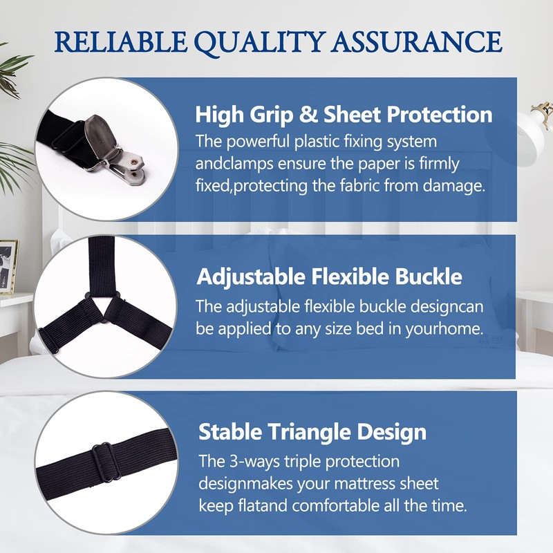 • <p>?Widely Used?:Our Sheet Straps fit for most fitted sheet and flat sheet, especially for Round and Square Mattresses. Perfect for your family or children and the elderly.</p>
