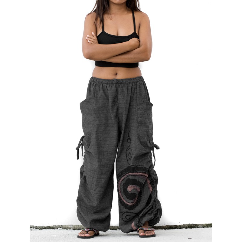 Thaluta Women's Harem Cotton Pants Loose Fit Yoga Spiral Print Pants with Pockets (Ash Black)