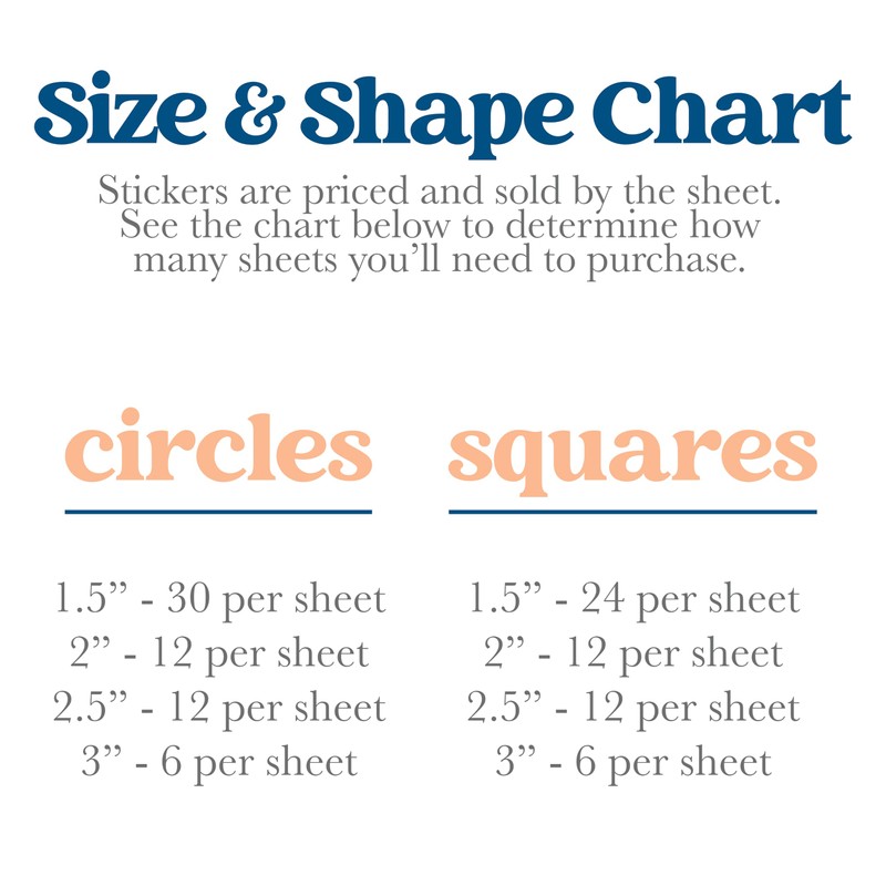 - Each quantity purchased is equal to one sheet; each size/shape has a specific number of stickers per sheet. See the "quantity per order" chart in the images for more information.
