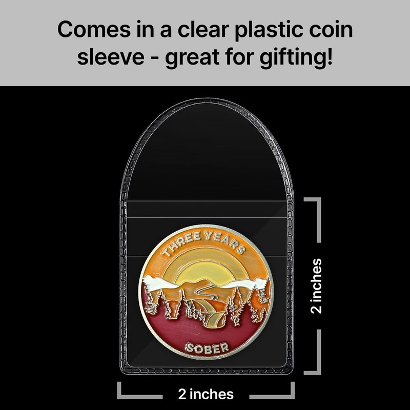 Celebrating 3 years of sobriety is no small feat, and this token exists to acknowledge the dedication, the struggle, and most importantly, the continual commitment to a sober lifestyle. The front of the medallion is a work of art in itself, featuring an awe-inspiring illustration of a tranquil sunset, cascading behind towering mountains.