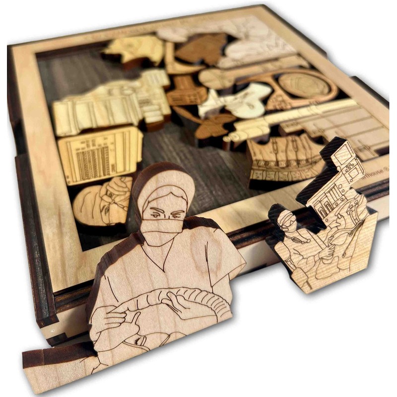 This will definitely not put you to sleep... Very challenging, you will need all your wits to solve and place all the equipment and scenes back into the frame. There are 18 pieces depicting equipment and scenes familiar to the Anesthesiologist. The instruction sheet below identifies each element of the puzzle and it includes Anesthesia Machine, Masimo Rad 5 Oximeter, Endotracheal Tube, LMA, Intubation Endoscope, Fiber Optic Laryngoscope blade, Tuohy Epidural needle, Propofol syringe, fiberoptic bronchoscope, and some scenes of the doctor at work. All pieces are laser cut and engraved from 1/4” hardwoods. Each puzzle will have at least 5 different woods used. Comes with base cover and measures about 7” square in the cover. We can personalize this puzzle with a name or brief message on the cover. Select that option below or contact me. Note that we have a broad range of picture frame puzzles honoring other professions in the medical area. An original Creative Crafthouse design with artwork by Anjali Rani 2020 Creative Crafthouse Made in Hudson, FL, USA