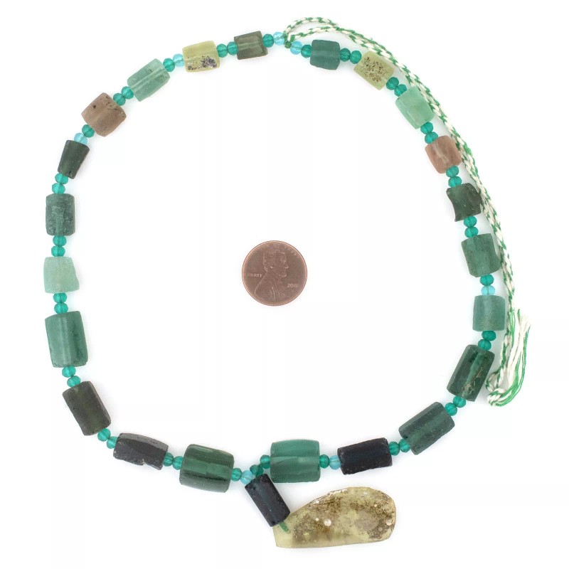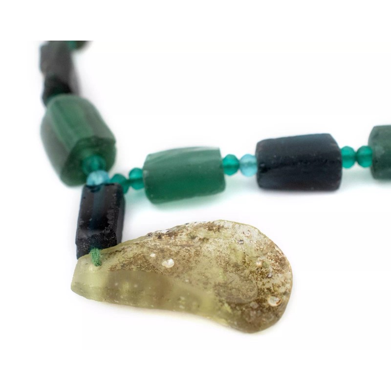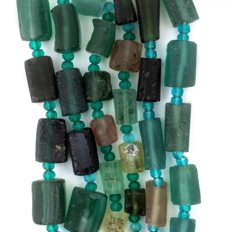 Admire this unique strand of beads made from ancient glass pieces found in the region along the historic silk road. Commonly referred to as Roman Glass, the material for these beads is derived from ancient cups, vases, and perfume containers that have sustained the travails of time. If you look carefully, you will see that these beads have a unique patina endowed by the mineral deposits where the glass lay buried. Each glass piece has been individually drilled and threaded to create a strand. No two strands are alike but you will receive a strand similar to that pictured. Some strands may have a pendant while others may not. Get yours today! Note that while the material is said to be of old, possibly ancient origin, the precise age of the glass has not been independently verified.