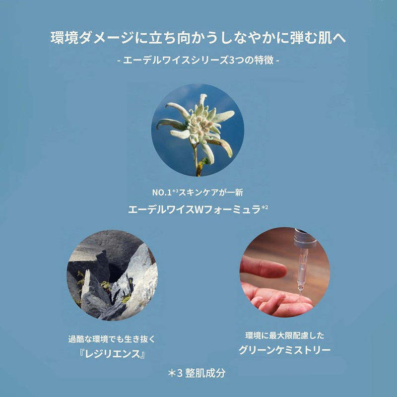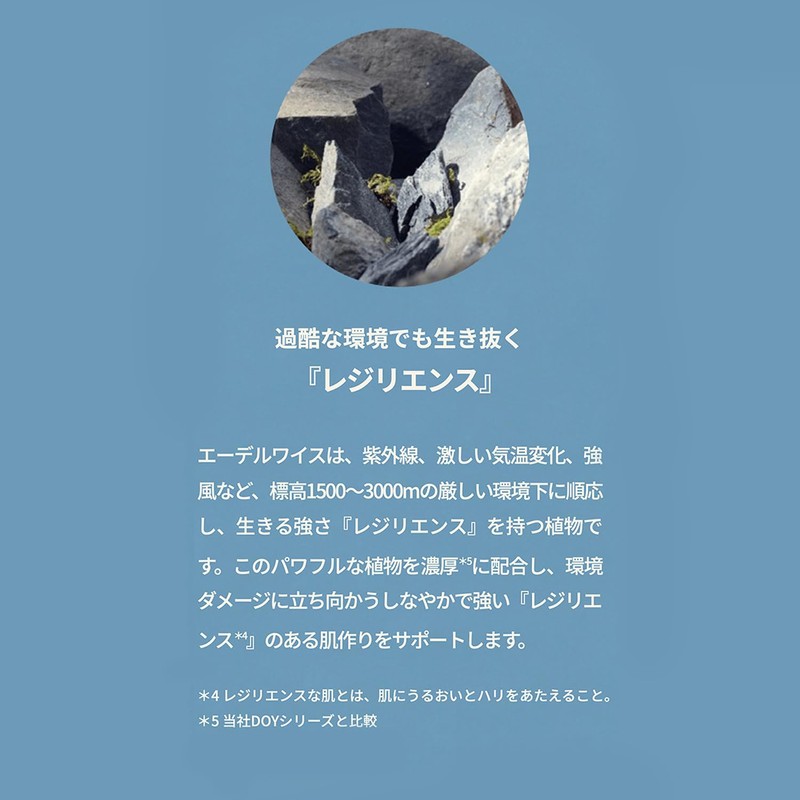 - 2 types of Edelweiss extracts that survive harsh environments and 4 komepeptides that lead to a fluffy, bouncy and smooth skin