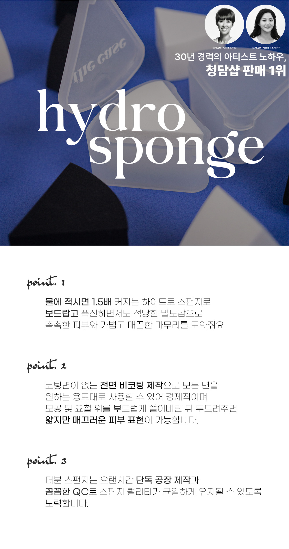 The hydro sponge becomes 1.5 times bigger in a wet condition. The soft and moderate density texture helps with making moisturizing skin and lightweight and smooth finish. The non-coating sides can be freely used, and this economical product makes thin and smooth skin expression when gently sweeping and tapping pores and uneven skin parts.