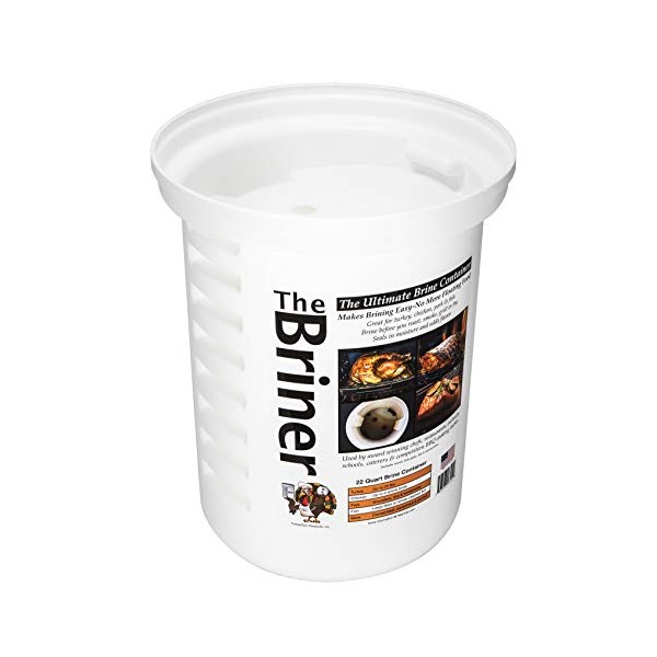 - 22 quart Brine Container. Patent Pending design resolves the biggest challenge to successful brining - floating food!