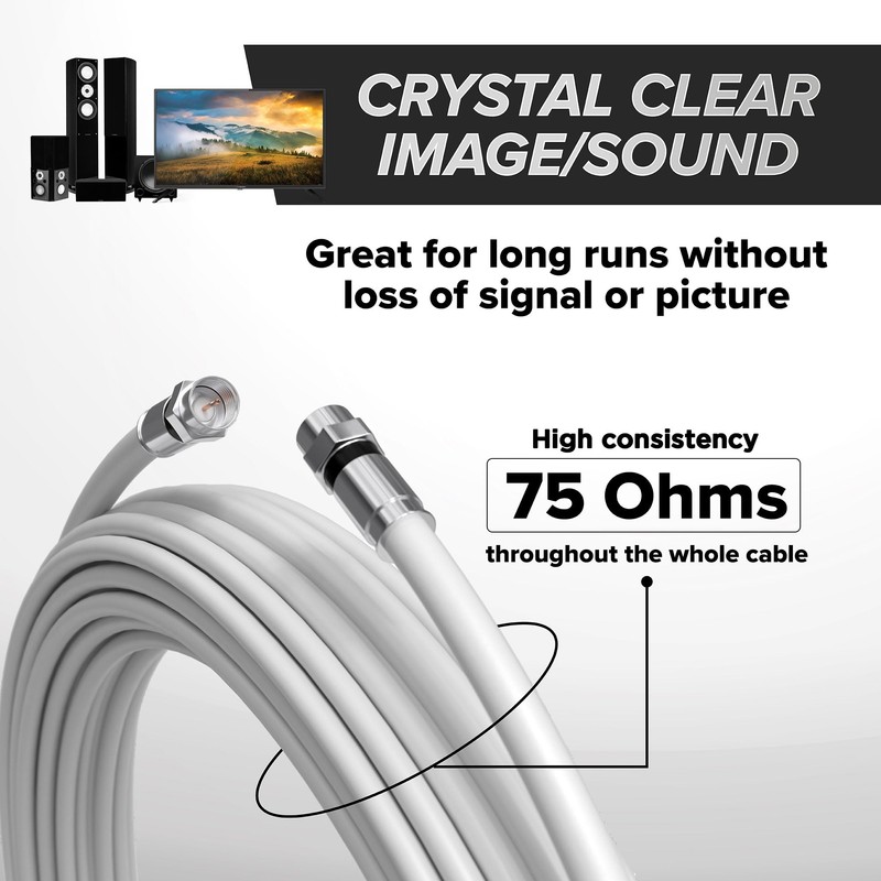 - Premium Construction: 18 AWG solid copper center conductor, UV resistant PVC outer jacket and 75Ohms Cable impedance