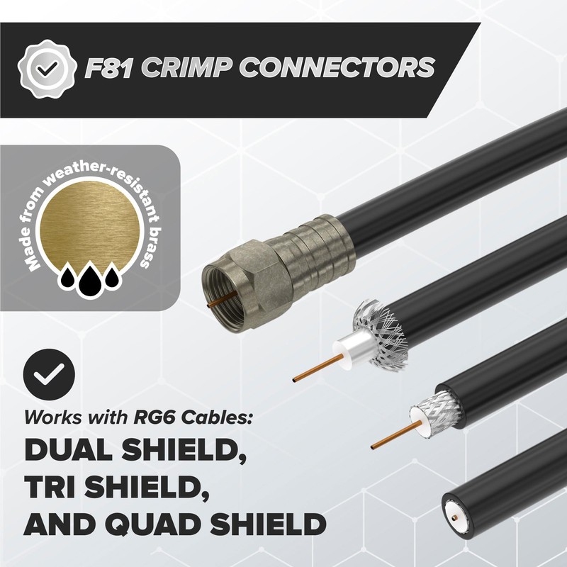 F81 Connectors, using the F-Pin connection (standard on US Cable systems). Rated from 2MHz 3GHz, this ensures that the coupler will handle all of the signals for DIRECTV, Satellite Dish, other Satellite, CATV (including Comcast, Charter, Cox, and more), as well as Antennas, VCRs, Cable Internet Modems, and other digital and analog systems. These will pass signal for 75Ohm coax wires. The connector works with most RG6 Coax, including Dual Shield, Tri Shield, and Quad Shield. Exceptional return loss and insertion loss specifications.
