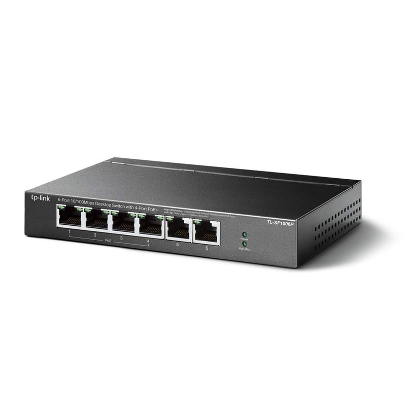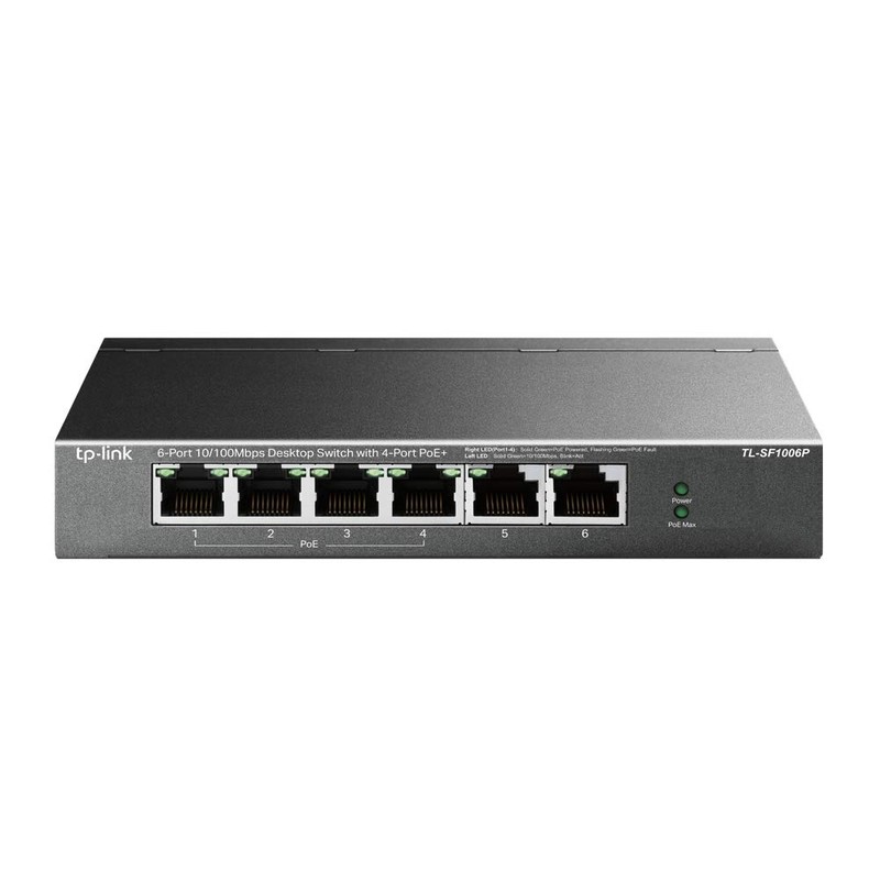 • 6× 10/100 Mbps RJ45 ports, 4× PoE+ ports transfer data and power on individual cables
