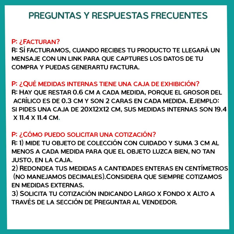 - AMPLIA VARIEDAD: tenemos más de 30 formas y tamaños de cajas. Busca nuestras publicaciones con el nombre THE DISPLAY BOX CO, elige la de la forma de caja que deseas y checa los diferentes tamaños que se ofrecen.