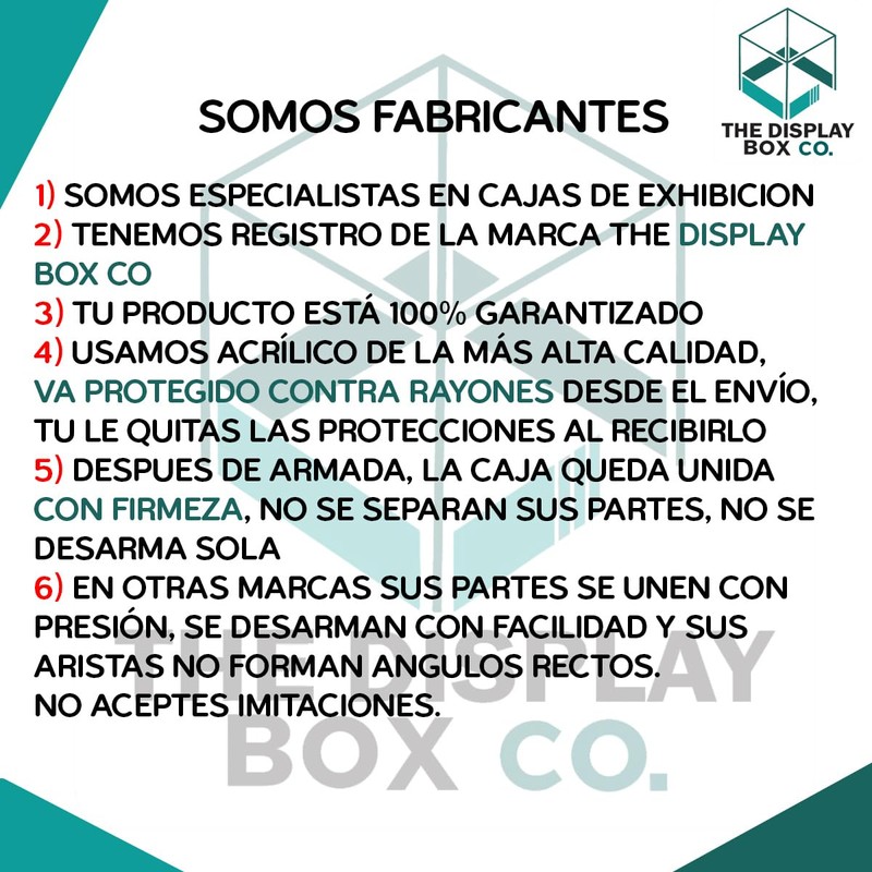 - ALTA TRANSPARENCIA: Ocupamos material acrílico de 3mm de grosor de la mejor calidad. La parte del display es 100% transparente y la base es acrílico negro. La visibilidad es completa desde cualquier ángulo y obtienes una caja que protege y da elegancia a tu objeto de colección.