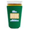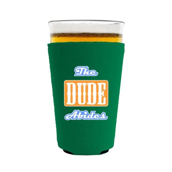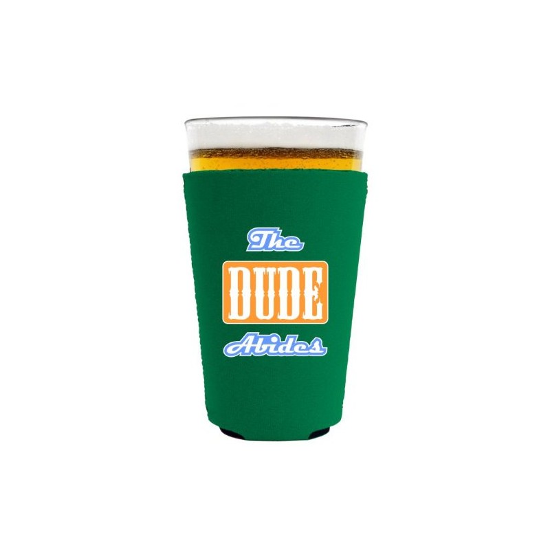 Made of 1/8" neoprene (wet suit) material. Built to fit 16 oz tapered pint glasses. Collapsible bottom, folds flat for storage. Graphic is a durable vinyl heat transfer, 1 side print.
