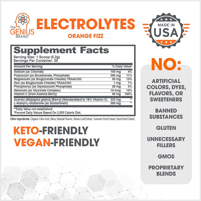 - The Smart Sports Drink: Optimize your hydration with Genius Electrolytes by The Genius Brand.* Featuring magnesium, potassium, and zinc, our formula sets itself apart by eliminating artificial colors, dyes, flavoring, and sweeteners completely. Genius Electrolytes is keto-friendly, vegan, and made in the USA without fillers, gluten, or GMOs. Orange Fizz flavor. 30 scoops per container.