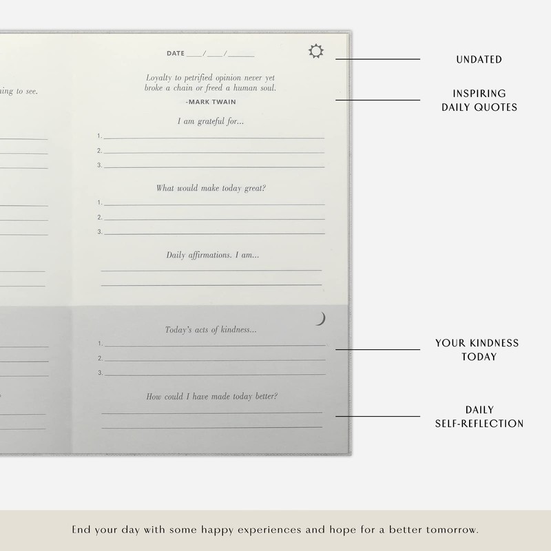 - ❤️Thoughtfully Designed - Undated Daily Layout : The undated gratitude journal lasts for 6 months of daily journaling. A simple undated structured format to boost happiness in few minutes a day that include: (Morning Section ) inspiring quotes, start the day with gratitude, what would make the day great, daily affirmation. (Evening Section ) Your act of kindness today, end of day self reflection. The journal using the highest quality book binding without the risk of the pages falling out.