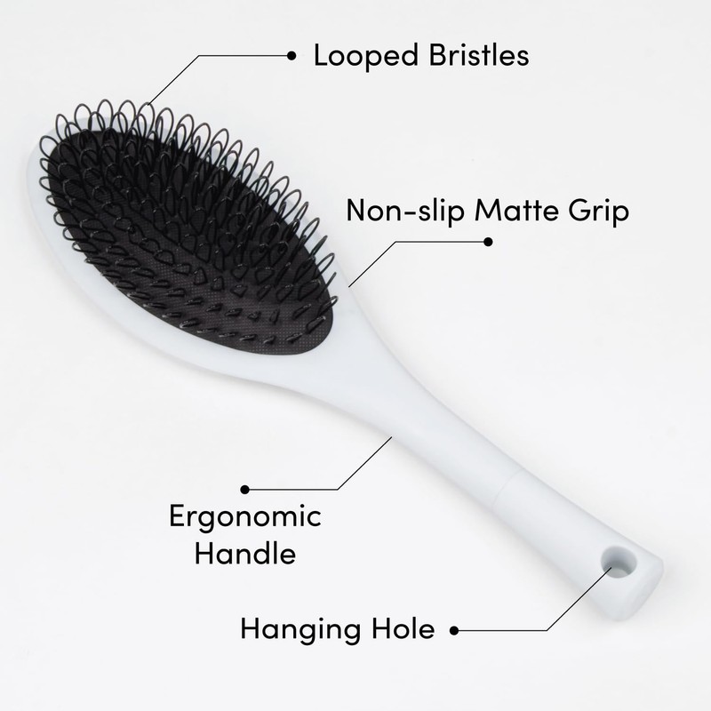 - ANTI SLIP - Matted Black Feel with a curved ergonomically designed round paddle, ensuring durability and comfort. The bristle on this brush is curved into a loop that allows a gliding effect. The Hair Shop Loop Brush brushes easily and most importantly, painlessly.