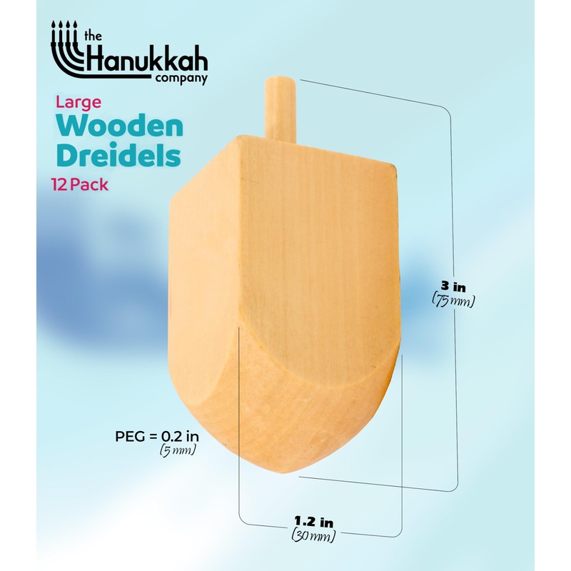 • DREIDELS FOR HANUKKAH: Extra Large Dreidel Natural Wooden. SIZE: 3" (75 mm) High x 1.2" (30 mm) wide, plus the spinning peg is 0.2". (5 mm) Pack Size: 12 Pack
