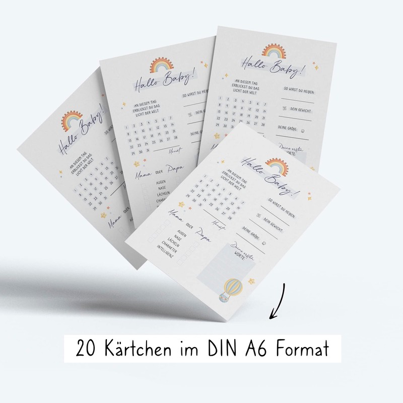 The holy fox® Babyshower Guessing Game - Cards with Rainbow in Light Blue to Fill in - Baby Tips for Baby Shower & Gender Reveal Celebration