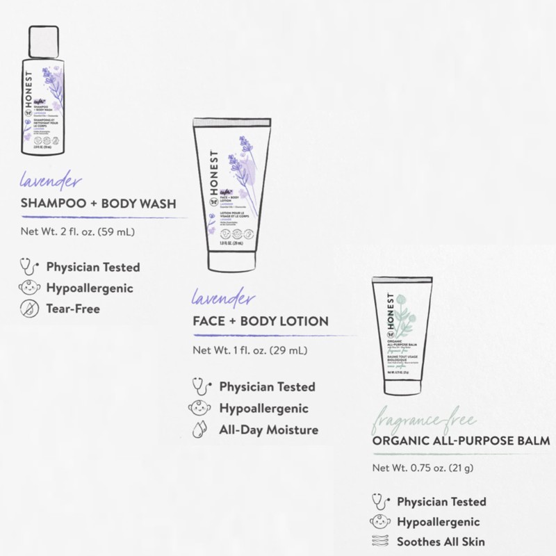 The Honest Company Babe's Mini Must Haves Gift Set | Travel Size Lavender Shampoo + Body Wash (2 fl oz), Face + Body Lotion (1 fl oz), Organic All Purpose Balm (.75 oz), Reusable Pouch