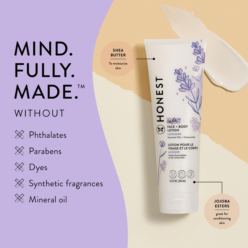 - Lavender Face and Body Lotion moisturizes and nourishes skin; Made with a blend of safflower oil, jojoba esters, and Vitamin E