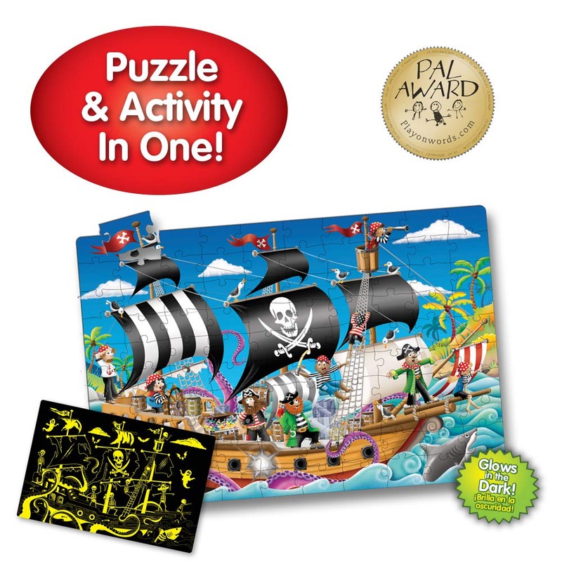 • Key features - This uniquely illustrated 100-piece glow in the dark puzzle is perfect for preschool pretend play and is a great gift for both boys and girls ages 3 and up. Designed to strengthen problem-solving and encourage early language and learning skills, This pirate themed puzzle makes it fun to learn through play. Double the puzzle fun as the scene changes When over 30% of the puzzle glows in the dark! The specs: 100 glow in the dark puzzle pieces made of thick, durable cardboard construction. Completed puzzle measures 36” x 24”.