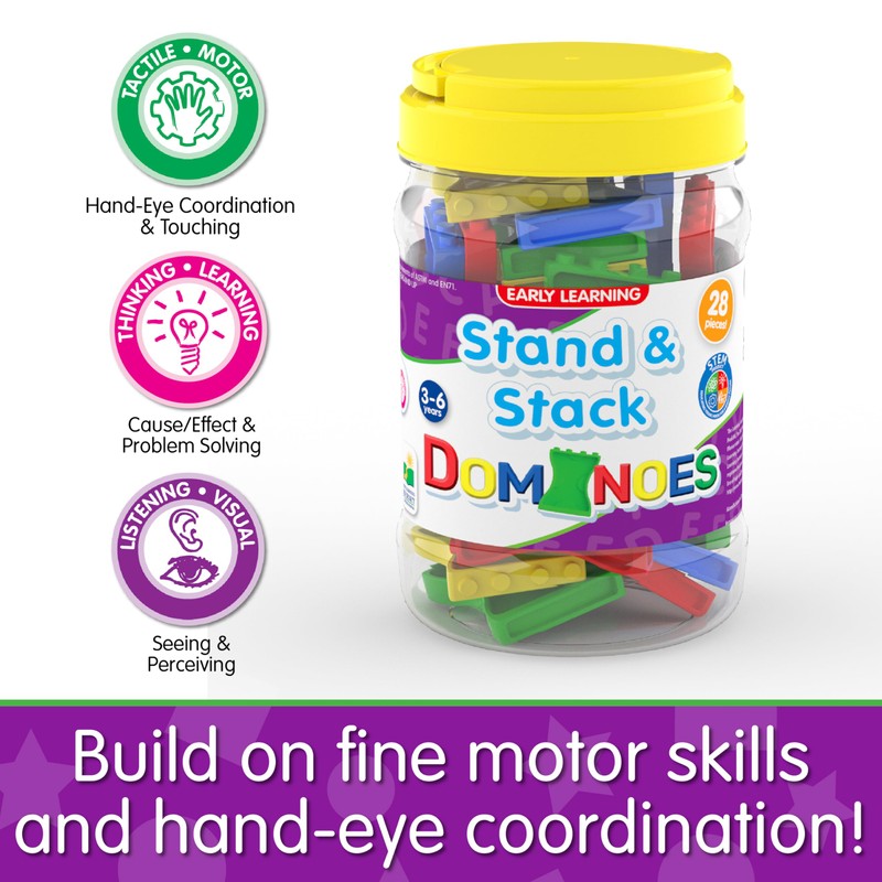 • KEY FEATURES - Design, build, knock down, and amaze with the Stand & Stack Dominoes! Kids will have a ton of hands-on fun with the set that includes 28 multicolored Dominoes specially designed to stack on top of one another. Sort, stack, line up and watch them tumble down in chain reactions - whatever your option is the Stand & Stack Dominoes are ready for creative learning fun! Ages 3-6 years.