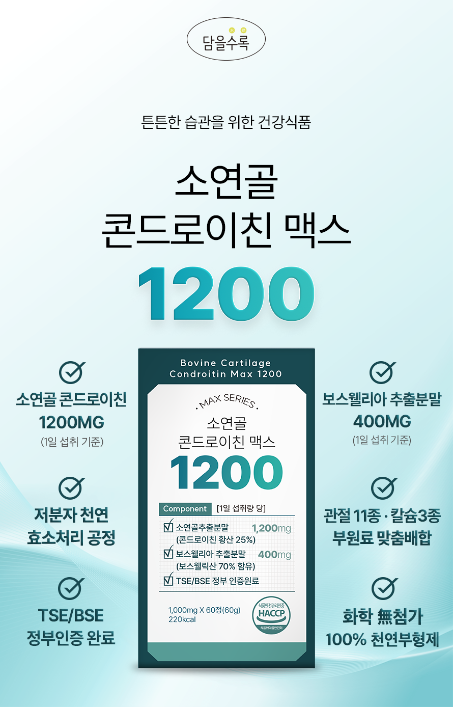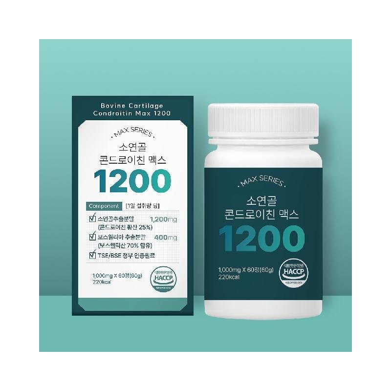 The more it contains, the more it contains Bovine Cartilage Chondroitin Max 1200 1000mg x 60 tablets, 6 boxes / HACCP certified, no options / 담을수록 소연골 콘드로이친 맥스 1200 1000mg x 60정 6박스 / HACCP 인증, 옵션없음