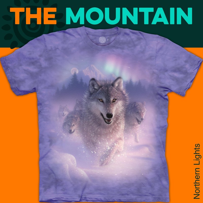 - Depicting a pack of wolves running through snow, this T-shirt will be a perfect addition to your nature-inspired apparel. A colorful aurora borealis in the night sky evokes a sense of serenity among the wolves on the hunt