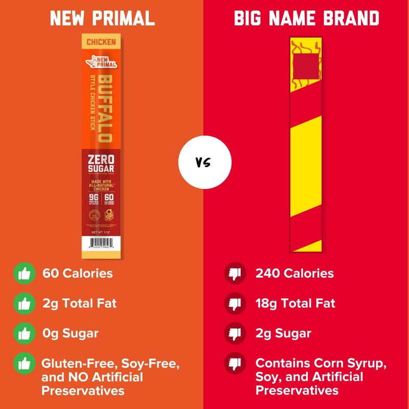 - 9G PROTEIN PER SERVING: New Primal buffalo chicken sticks are the perfect high protein snacks, that are portable and easy to eat. Feed your inner carnivore - each chicken meat stick has 9g of protein and just 60 calories per stick.