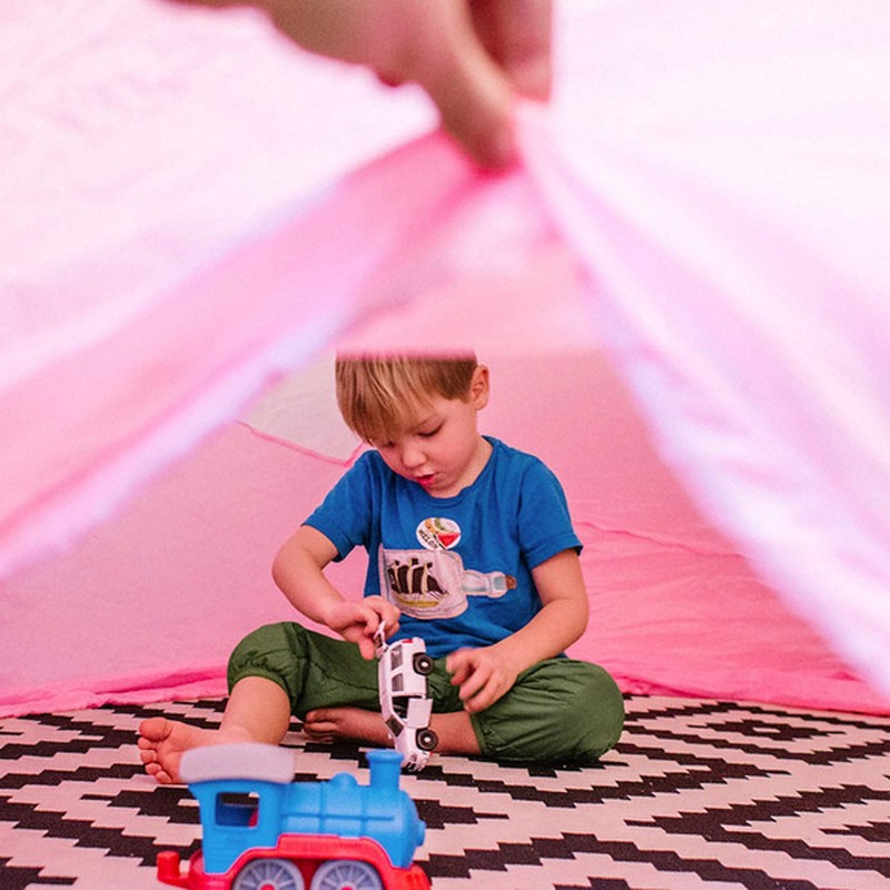 - No floor for an easy entrance and exit, viewing window for kids to see in and out, and mesh divider preventing kid's access to fan