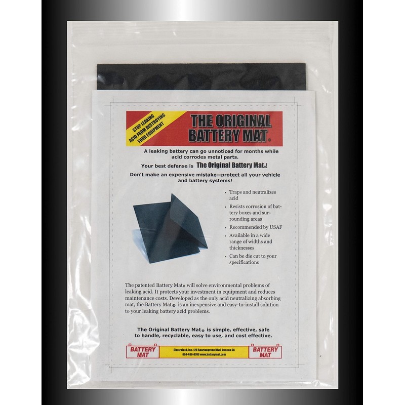 A leaking battery can go unnoticed for months while acid corrodes metal parts. Your best defense is The Original Battery Mat! Don’t make an expensive mistake—protect all your vehicle and battery systems! The patented Battery Mat will solve environmental problems of leaking acid. It protects your investment in equipment and reduces maintenance costs. Developed as the only acid neutralizing absorbing mat, The Original Battery Mat is an inexpensive and easy-to-install solution to your leaking battery acid problems. The Original Battery Mat is simple, effective, safe to handle, recyclable, easy to use, and cost effective. Product size is 8" x 12" and approximately 3/16" thick. It can be trimmed to fit your application. MADE IN THE USA!