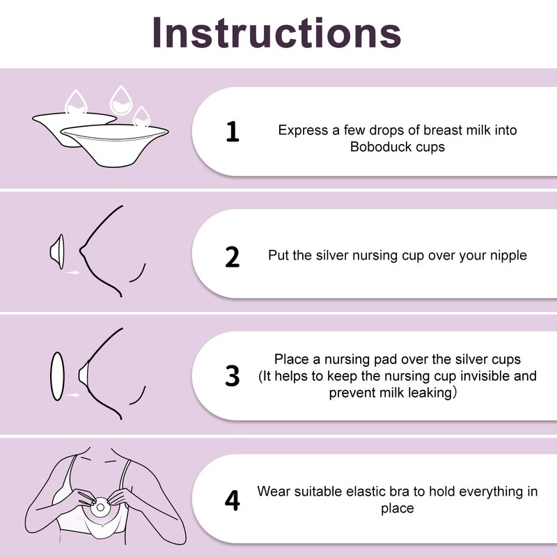 - Easy to use: 1. Express a few drops of breast milk into each breastfeeding nipple shield cup; 2.Put the silver nursing cup over your nipple;3.Place a nursing pad over the silver cups (It helps to keep the nursing cup invisible and prevent milk leaking); 4. Use bra of your choosing to hold everything in place.