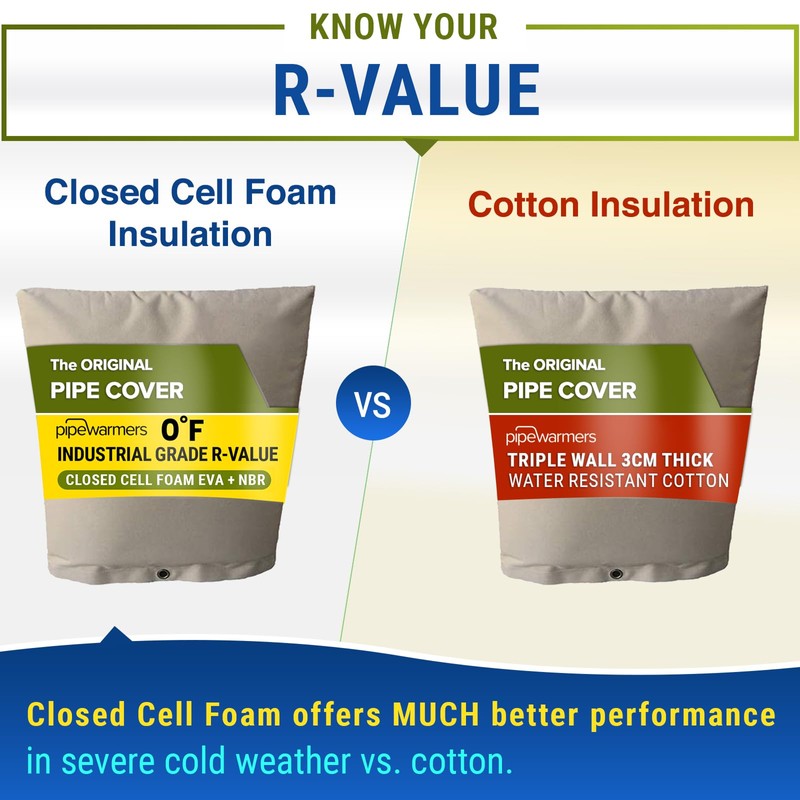 - SEVERE WEATHER PROTECTION –Snow, rain, wind, and even intense heat – our insulation covers are industrial grade for the home user and fully water-resistant, water-proof, and fit like a glove. Cheaper Insulation covers will wear out and look tattered whereas Pipewarmers can withstand the elements. Our top of the line materials can endure freezing temperatures as low as 5 degrees, providing reliable insulation throughout the winter season.