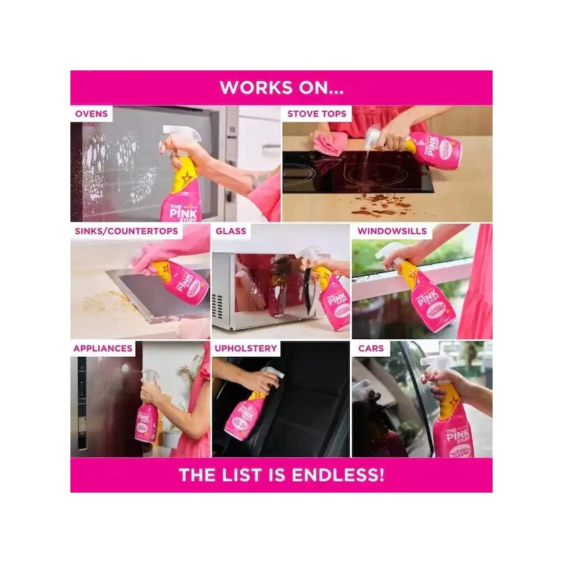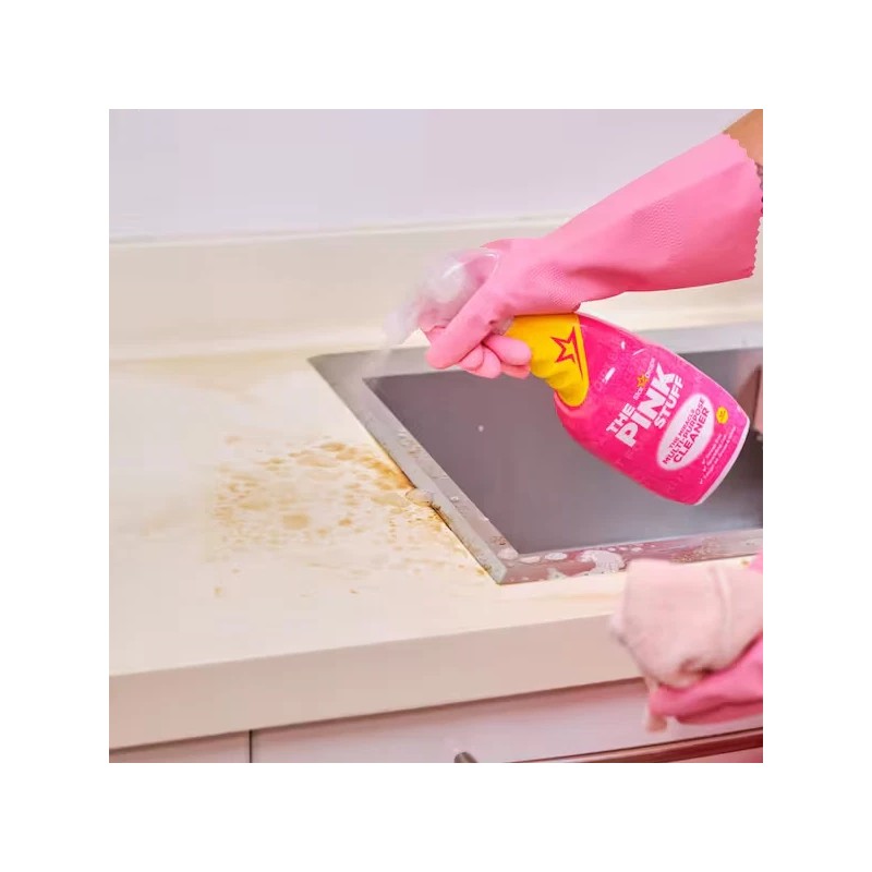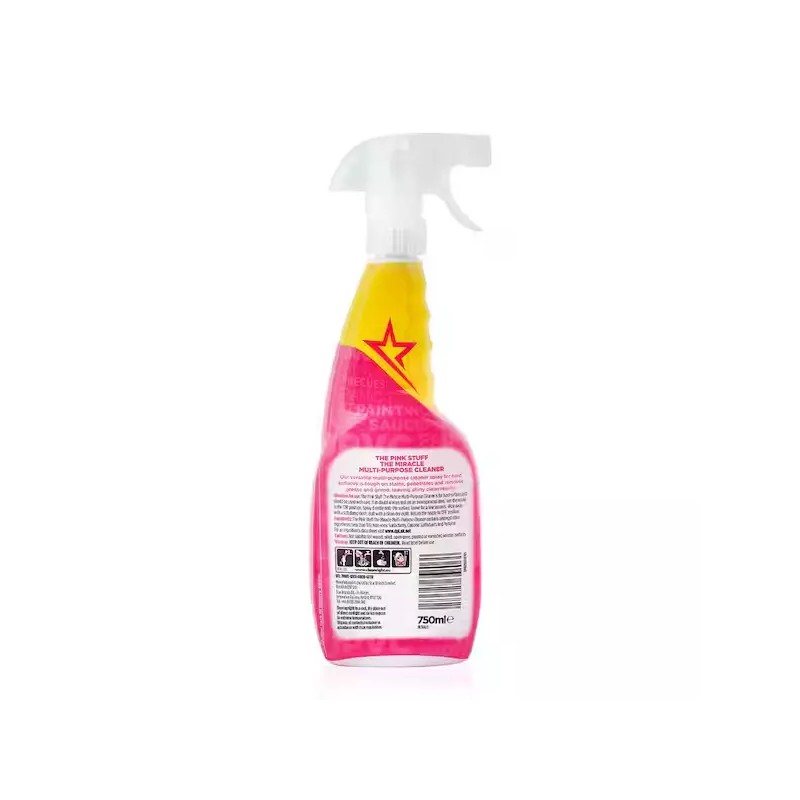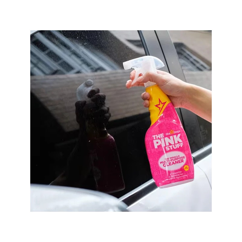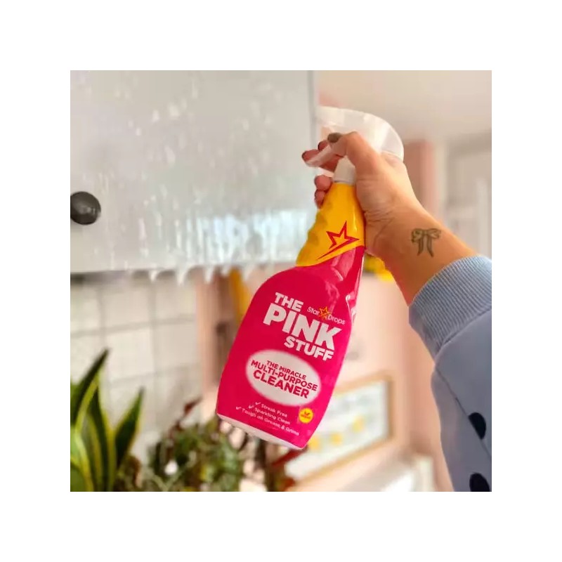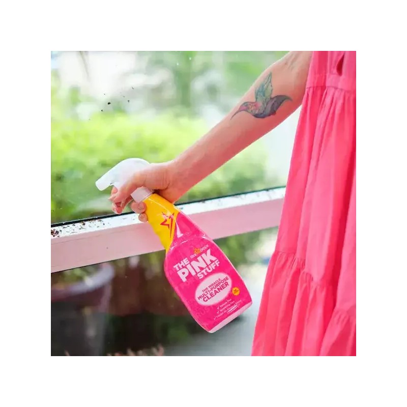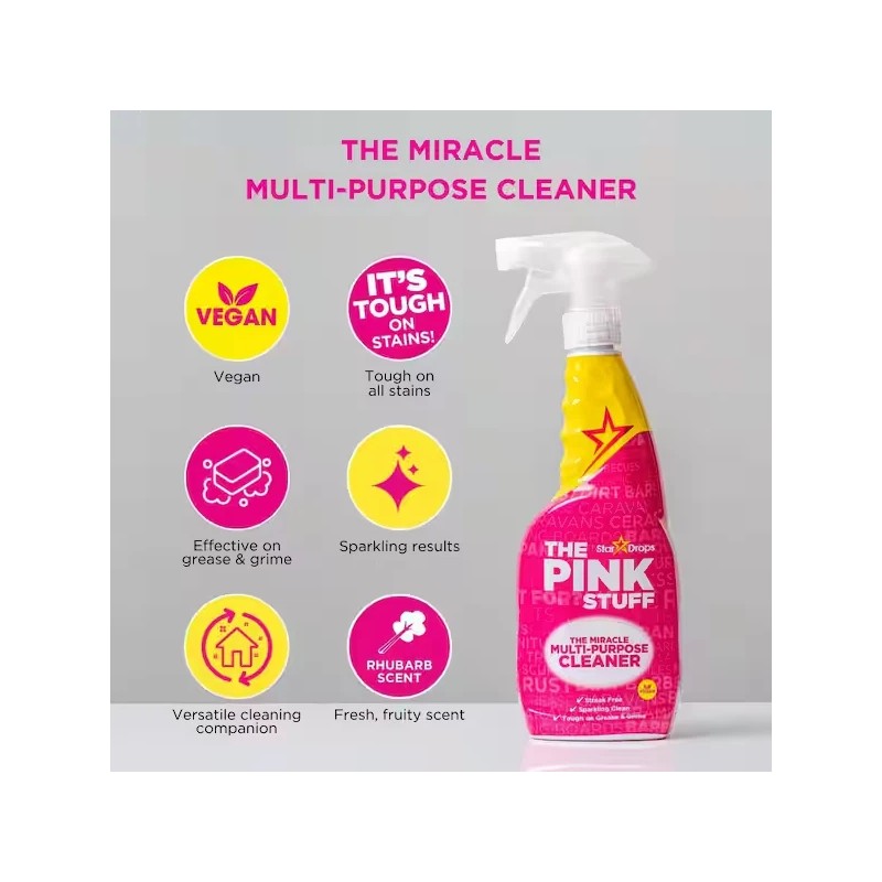 THE PINK STUFF Miracle Multi-Purpose Cleaner is a versatile multi-spray cleaner made for all kinds of hard surfaces at home. Whether you need to clean indoors or outdoors, this natural cruelty-free vegan cleaning spray removes stubborn dirt, grease and grime with ease. Well-loved by millions, it's a must-have in any kind of household. Safe yet tough on stains, it's formulated with a fresh and fruity Rhubarb scent the whole family will absolutely love. This easy-to-use spray can be used on virtually everything, including counters, cookers, floors, ceramic, tile, pots and pans, grills, sinks, boats, scuff marks, windows and so much more. It can even penetrate and tackle grease like a champ without leaving any gross residue behind, which is what many multi-purpose cleaners tend to fail to do. This 100%-natural cleaner is the perfect partner to spruce up your home and keep it extra clean, shiny and sparkly without damaging surfaces.