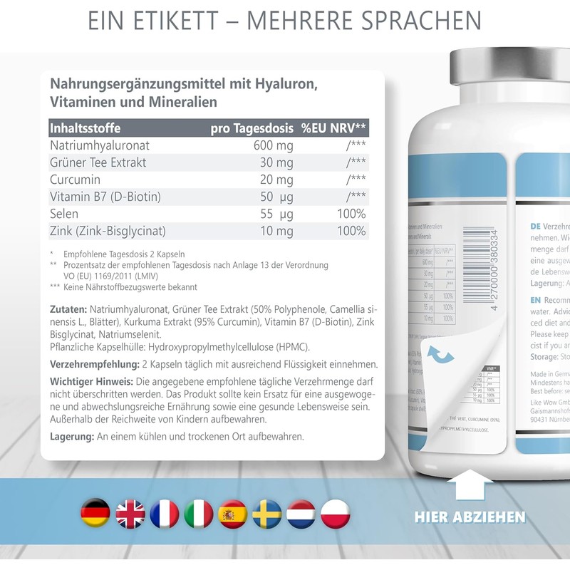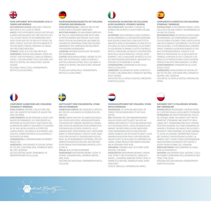 The indicated daily dose of the high-dose hyaluronic capsules with curcumin, biotin, selenium, zinc and green tea should not be exceeded. Dietary supplements should not be a substitute for a balanced diet as well as a healthy lifestyle.