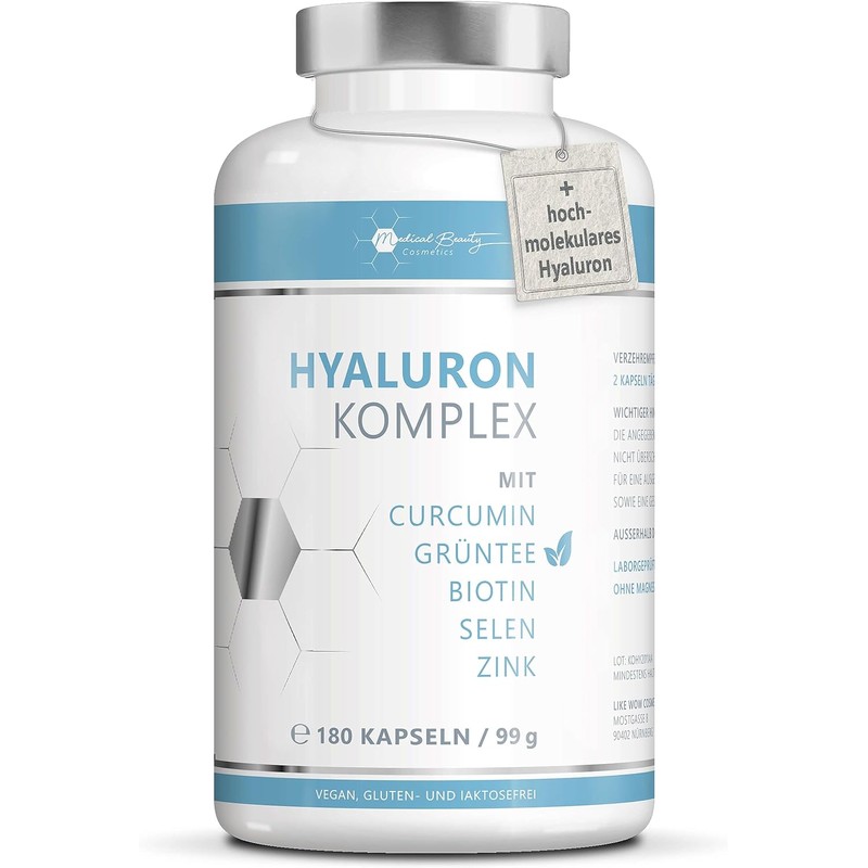 The Test Winner 2023: Medical Beauty Cosmetics 180 Hyaluronic Acid Capsules High Dose - 600 mg with Zinc, Curcumin and Green Tea Extract - Hyaluronic Capsules with Biotin, Selenium for Beautiful Skin, Hair, Bones, Joints, from Germany