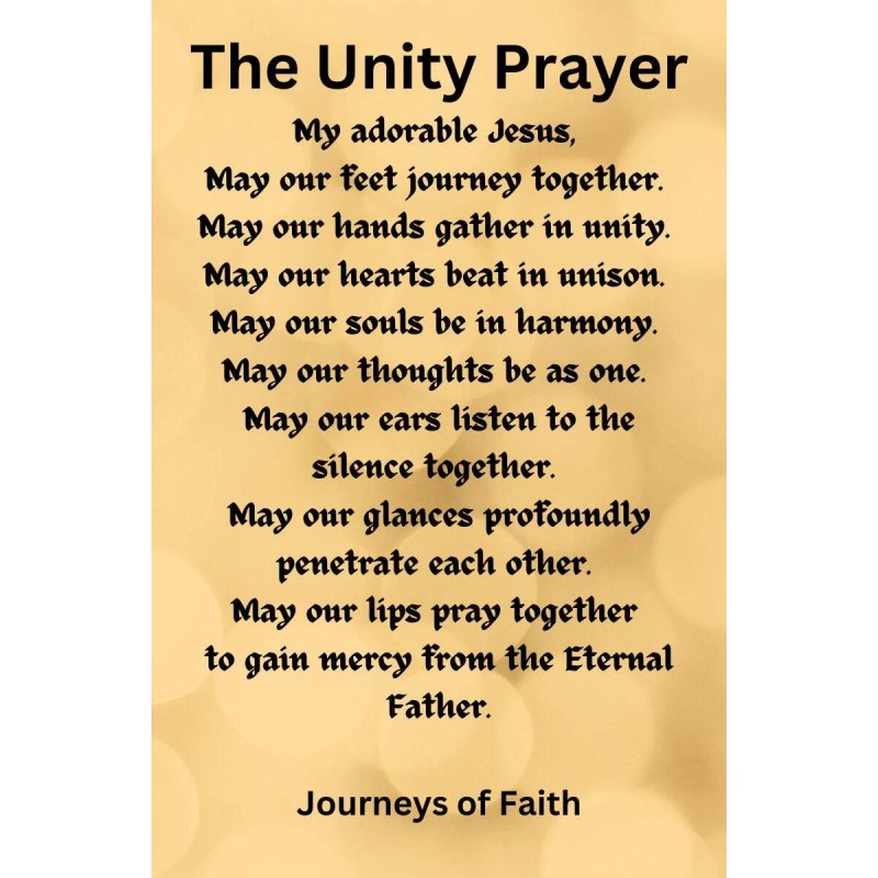 THE UNITY PRAYER GIVEN BY THE LORD JESUS CHRIST TO ELIZABETH KINDELMANN My Adorable Jesus, May our feet journey together, May our hands gather in unity, May our hearts beat in unison, May our souls be in harmony, May our thoughts be as one, May our ears listen to the silence together, May our glances profoundly penetrate each other, May our lips pray together to gain mercy from the Eternal Father. Amen. *